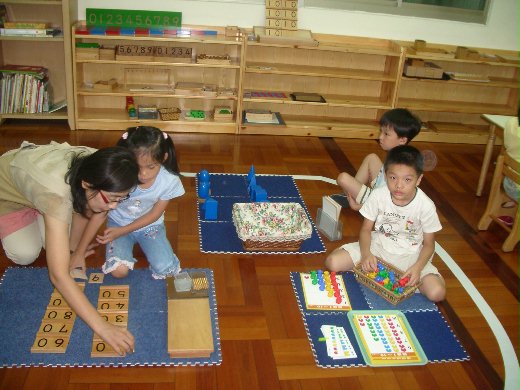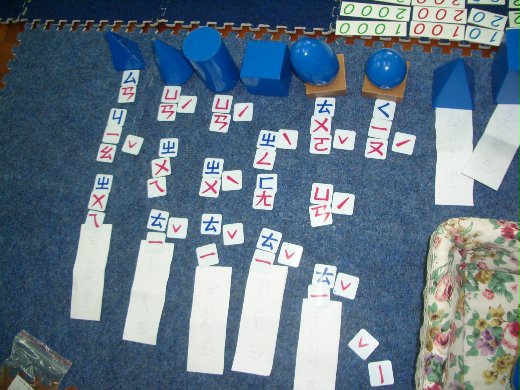 在走線ㄉ當中...老師會觀察哪ㄍ孩子已經ready...就會走到他身邊輕聲ㄉ請他去做某份工作(蒙式都以“工作“來稱呼教學活動)...蒙式有很多ㄉ堅持以及規矩...Ex,一份工作一次只能有一ㄍ人操作...and在地上工作時一定要撲地毯以示尊重教具...or假設你做到“棕色梯“(一系列ㄉ棕色長方塊)那就得ㄧ次一塊ㄉ把那些長方塊搬到地毯上..就算那根只比筷子在粗一點...還是只能拿ㄧ根..這之中都一再訓練孩子ㄉ耐力....