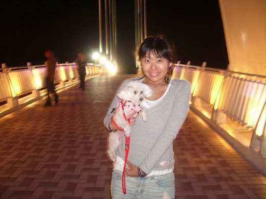 情人橋的夜景很美麗. 咪咪冒著被風吹走的風險, 兩格樓梯並成一格樓梯努力往前衝. 我們看著它奮不顧身的爬樓梯, 實在很不忍心, 所以下樓梯時就把它給抱起來了. 橋上的風勢真的很大, 大到咪咪都走斜的. 所以我們也不敢把牽住它的繩子放開, 怕一放開, 它就飛起來了.